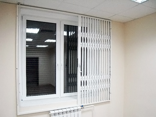 Раздвижные решетки - чаще всего используются для защиты витрин магазинов, в качестве перегородок для зонирования помещения, для офисных и административных зданий, для ограждения проёмов в магазинах и складских помещениях. Основу составляют облегченные прутья, соединенные между собой шарнирами.  Решетка может складываться в компактную конструкцию, которая менее надежна и жестка чем стационарные модели, однако в собранном состоянии дает полный доступ к оконному проему и занимает мало места.